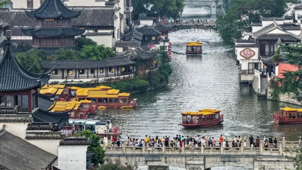 A drone photo taken on Oct. 7, 2025 shows tourists visiting the Fuzi (Confucius) Temple scenic area in Nanjing, east China's Jiangsu Province. (Xinhua/Li Bo)